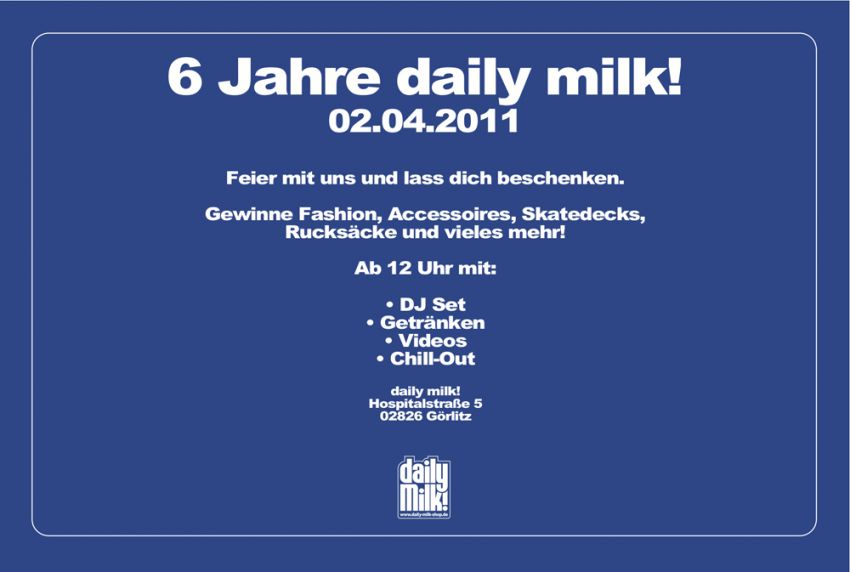 6 years dailymilk…drop in, win stuff, get a beer, musik, videos, chill out…be there!!!